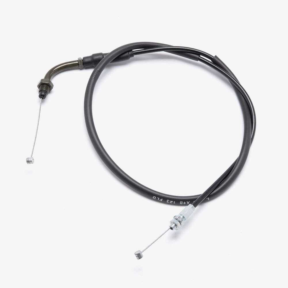 The throttle cable in a motorcycle is a flexible, wire-reinforced cable that connects the throttle grip to the throttle body or carburetor. It transmits the rider's input from twisting the throttle grip to the engine’s air intake system, allowing for precise control of engine power and acceleration. The throttle cable is designed to be durable and resistant to wear, providing smooth and reliable operation. Proper adjustment and maintenance of the throttle cable are essential for ensuring responsive throttle control and optimal engine performance.