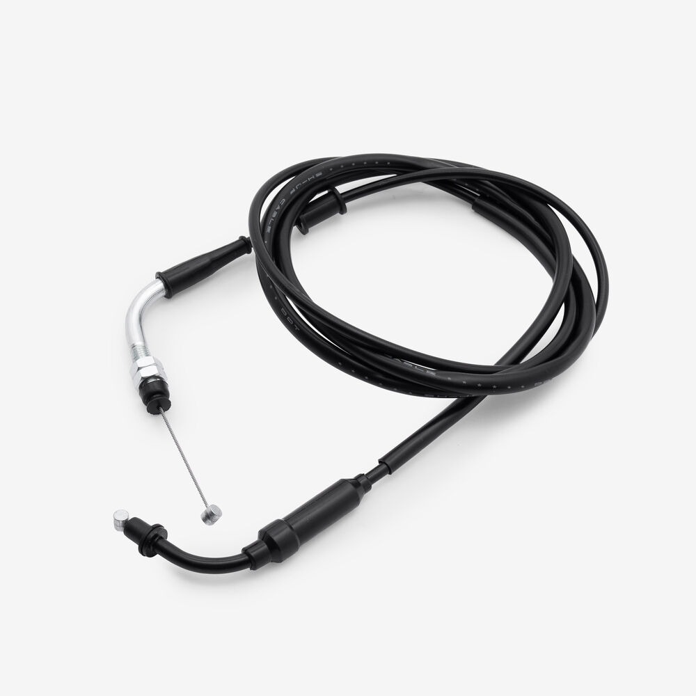 The throttle cable in a motorcycle is a flexible, wire-reinforced cable that connects the throttle grip to the throttle body or carburetor. It transmits the rider's input from twisting the throttle grip to the engine’s air intake system, allowing for precise control of engine power and acceleration. The throttle cable is designed to be durable and resistant to wear, providing smooth and reliable operation. Proper adjustment and maintenance of the throttle cable are essential for ensuring responsive throttle control and optimal engine performance.