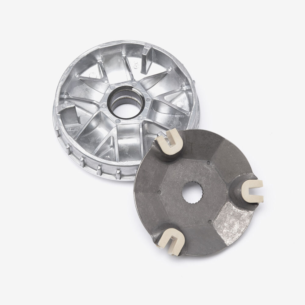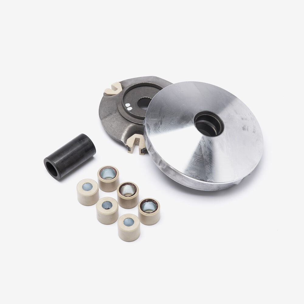 A variator is a component in a motorcycle's continuously variable transmission (CVT) system, commonly found in scooters and some automatic motorcycles. It is responsible for adjusting the gear ratio smoothly and continuously as the vehicle accelerates or decelerates. The variator consists of a set of adjustable pulleys and weights that change their position relative to each other, altering the diameter of the pulley and thus the gear ratio. This allows for seamless acceleration and efficient power delivery without the need for manual gear changes. The variator helps optimize engine performance and fuel efficiency by providing a range of gear ratios for varying riding conditions.