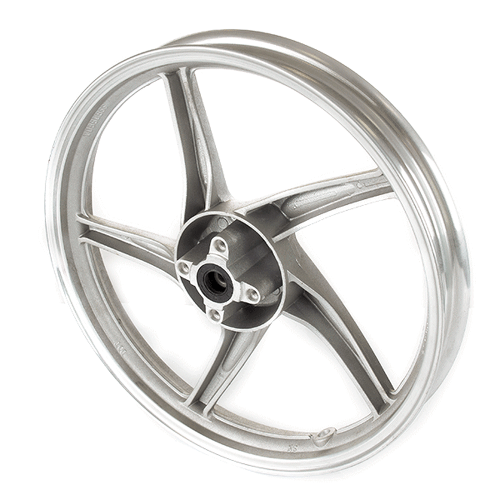 Code:WHLF155PLU:29871EAN:5057645335689Brand:CMPOColour:SilverFinish:PaintedItems included:WheelMachine Type:ScooterManufacturer Part Number:WHLF155Manufacturer Warranty:1 YearNumber of Studs:4Offset (ET):Not AvailablePlacement on Vehicle:FrontReference OE/OEM Number:166000007Stud Diameter:Not AvailableType:WheelUnit Quantity:1Unit Type:UnitWheel Construction:Gravity CastWheel Diameter:14Wheel Material:SteelWheel Style:5 SpokeWheel Width:1.5