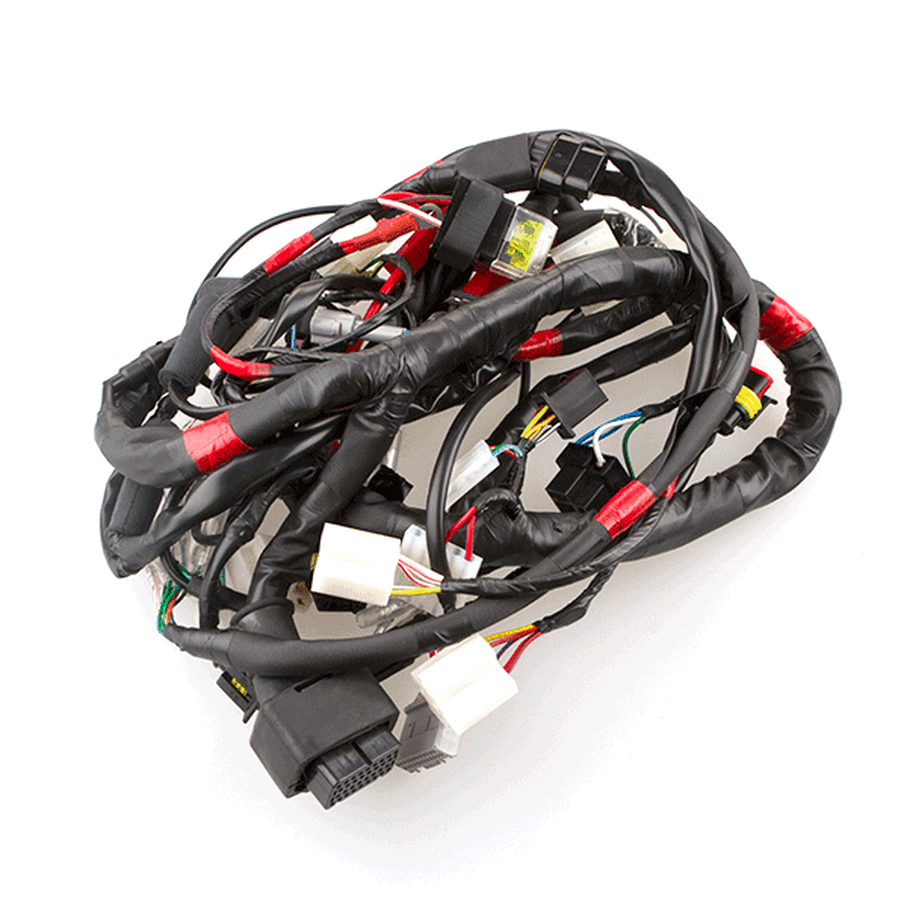 A motorcycle wiring loom, also known as a wiring harness, is a bundle of wires and connectors that transmits electrical power and signals throughout the motorcycle. It organizes and protects the electrical wiring, ensuring connections between components such as the ignition system, lighting, and various sensors. The loom is typically wrapped in protective sheathing to guard against wear and damage, and is designed to streamline installation and maintain a neat, efficient electrical system.