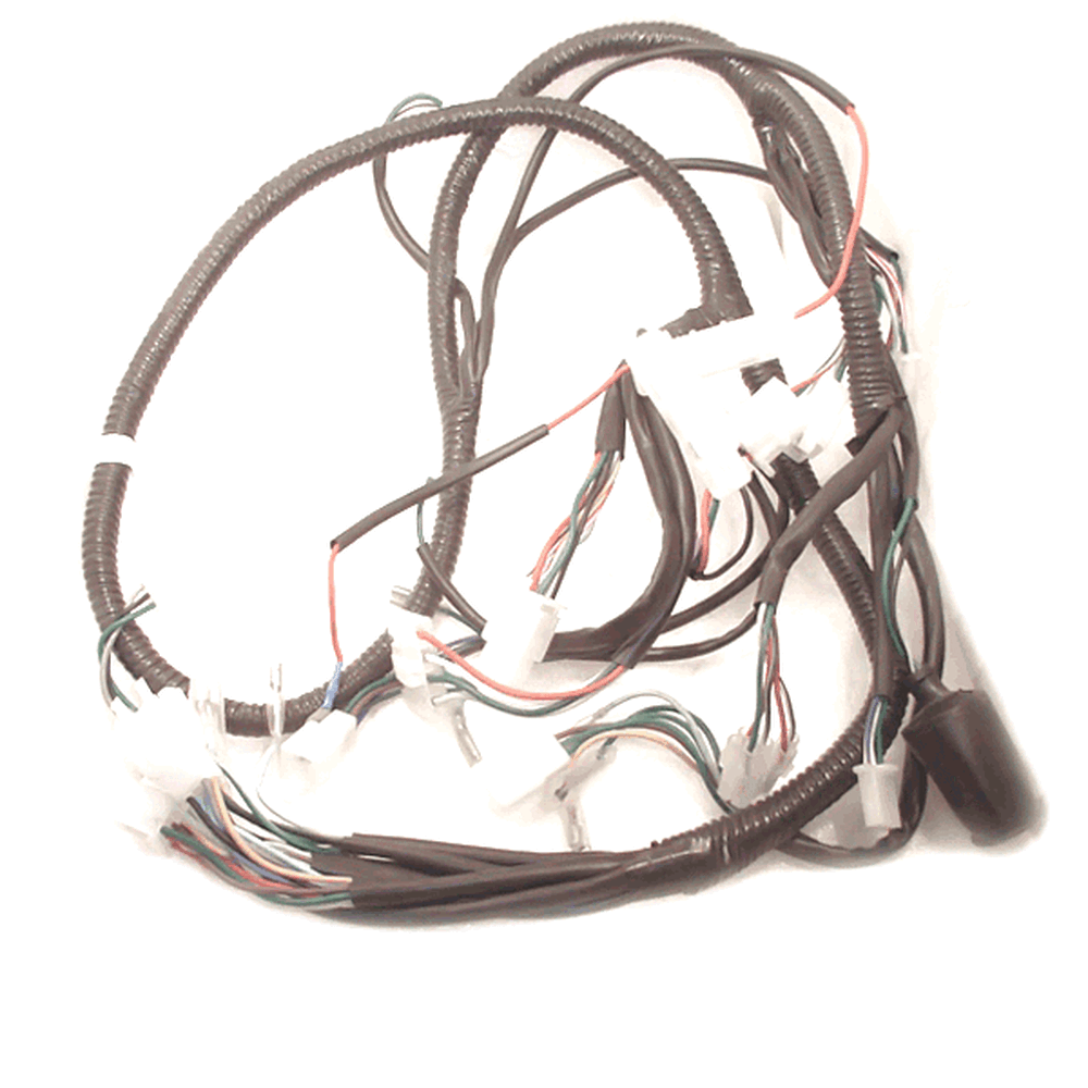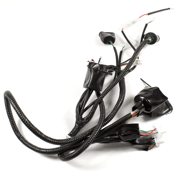 A motorcycle wiring loom, also known as a wiring harness, is a bundle of wires and connectors that transmits electrical power and signals throughout the motorcycle. It organizes and protects the electrical wiring, ensuring connections between components such as the ignition system, lighting, and various sensors. The loom is typically wrapped in protective sheathing to guard against wear and damage, and is designed to streamline installation and maintain a neat, efficient electrical system.