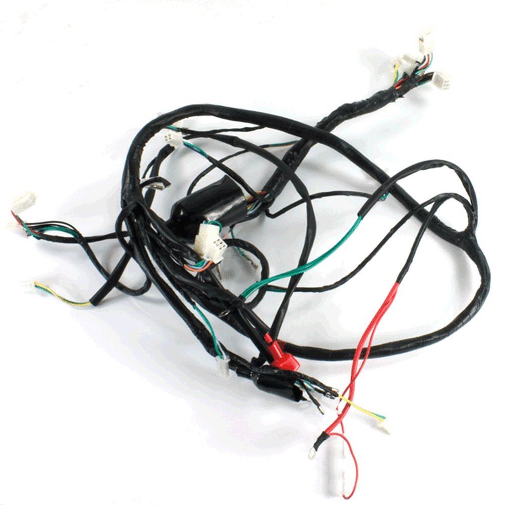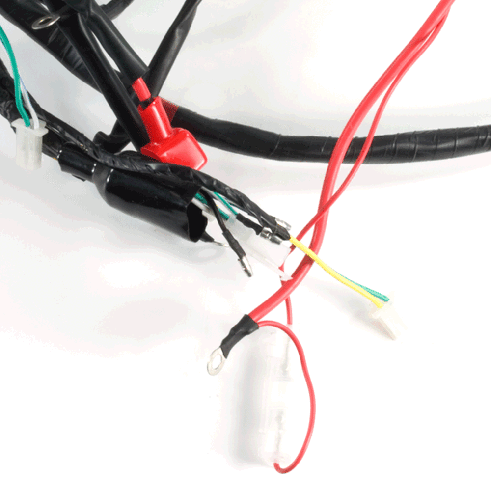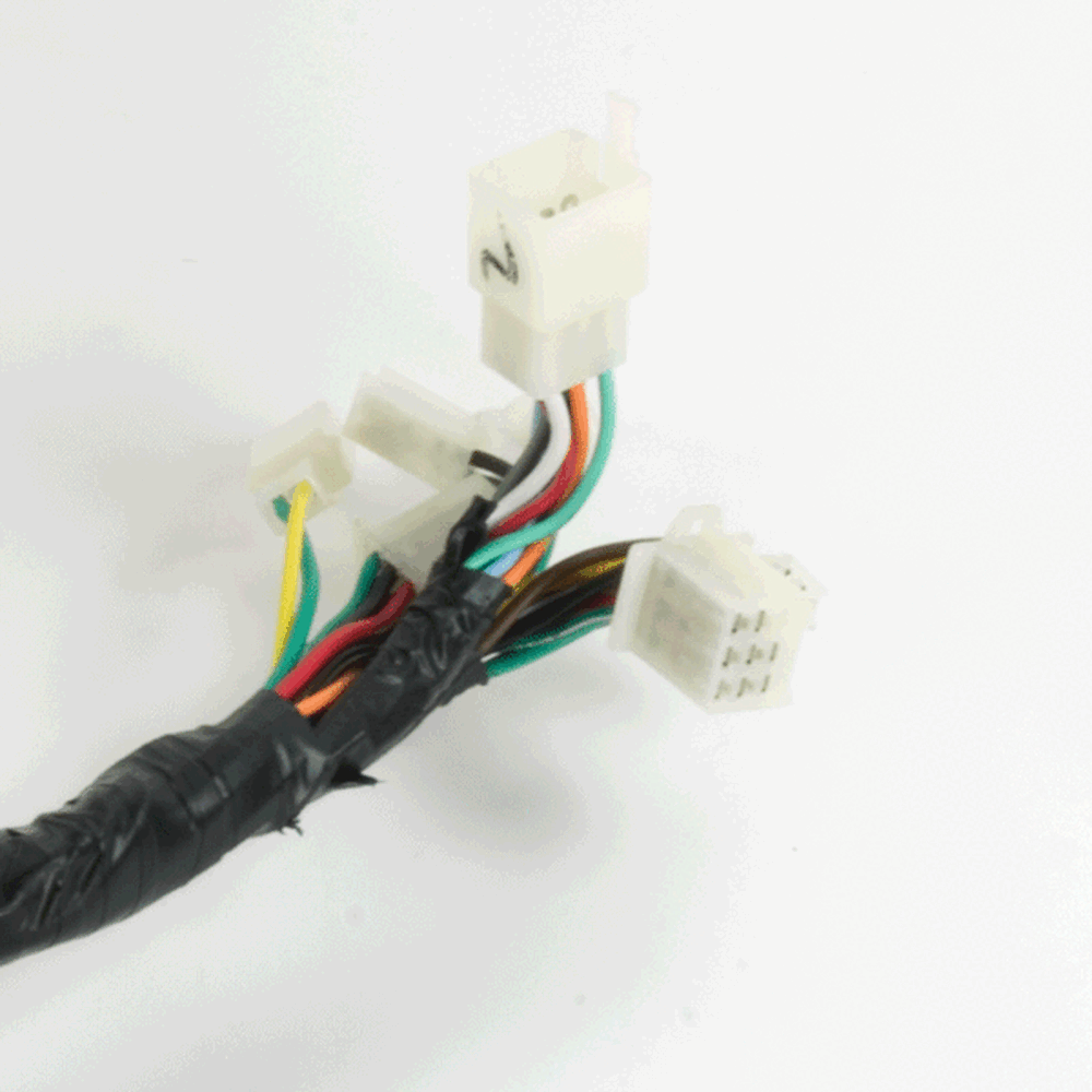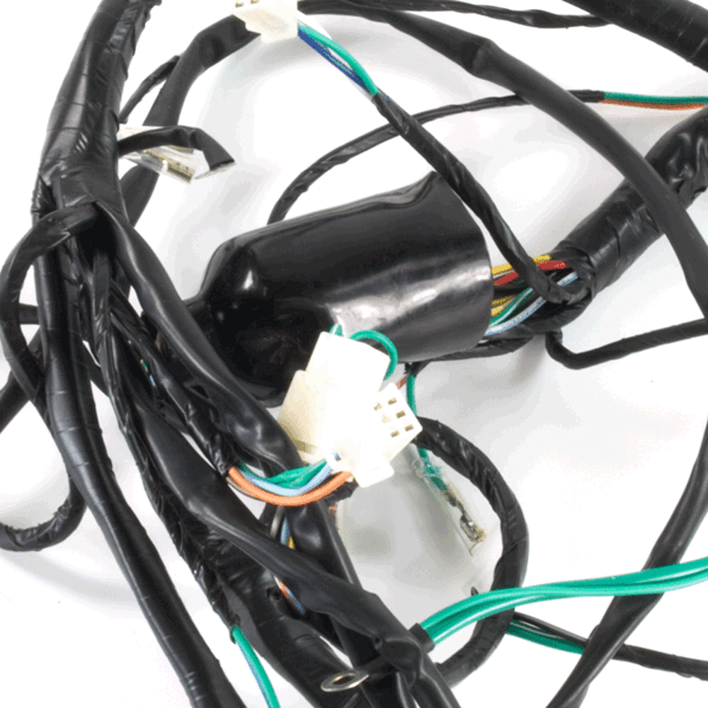 A motorcycle wiring loom, also known as a wiring harness, is a bundle of wires and connectors that transmits electrical power and signals throughout the motorcycle. It organizes and protects the electrical wiring, ensuring connections between components such as the ignition system, lighting, and various sensors. The loom is typically wrapped in protective sheathing to guard against wear and damage, and is designed to streamline installation and maintain a neat, efficient electrical system.