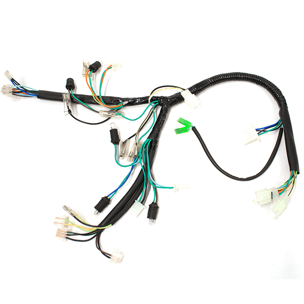A motorcycle wiring loom, also known as a wiring harness, is a bundle of wires and connectors that transmits electrical power and signals throughout the motorcycle. It organizes and protects the electrical wiring, ensuring connections between components such as the ignition system, lighting, and various sensors. The loom is typically wrapped in protective sheathing to guard against wear and damage, and is designed to streamline installation and maintain a neat, efficient electrical system.