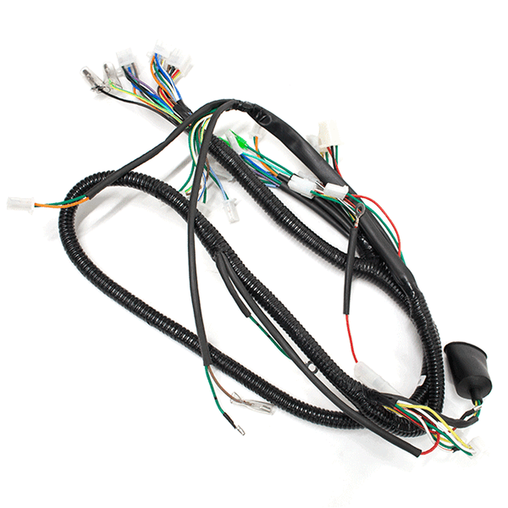 A motorcycle wiring loom, also known as a wiring harness, is a bundle of wires and connectors that transmits electrical power and signals throughout the motorcycle. It organizes and protects the electrical wiring, ensuring connections between components such as the ignition system, lighting, and various sensors. The loom is typically wrapped in protective sheathing to guard against wear and damage, and is designed to streamline installation and maintain a neat, efficient electrical system.