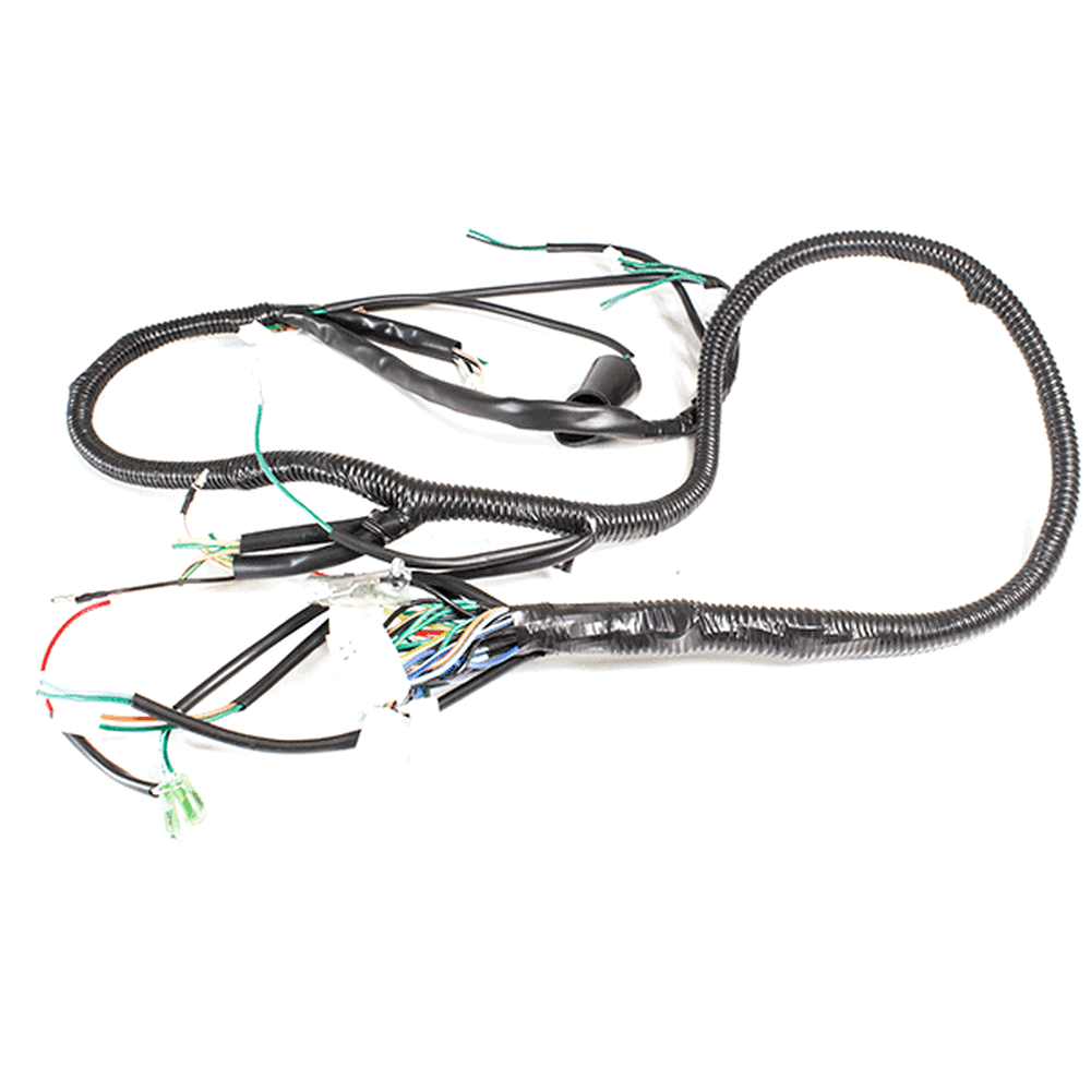 A motorcycle wiring loom, also known as a wiring harness, is a bundle of wires and connectors that transmits electrical power and signals throughout the motorcycle. It organizes and protects the electrical wiring, ensuring connections between components such as the ignition system, lighting, and various sensors. The loom is typically wrapped in protective sheathing to guard against wear and damage, and is designed to streamline installation and maintain a neat, efficient electrical system.