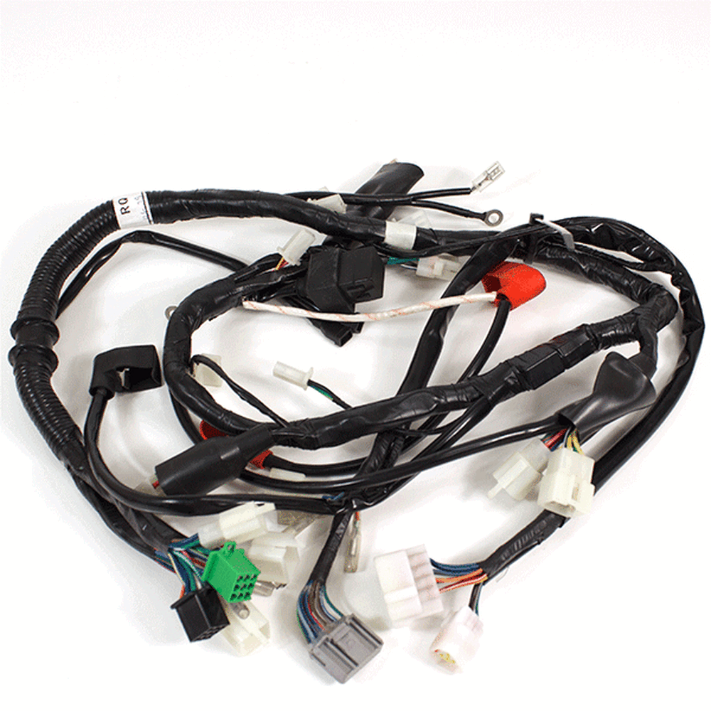 A motorcycle wiring loom, also known as a wiring harness, is a bundle of wires and connectors that transmits electrical power and signals throughout the motorcycle. It organizes and protects the electrical wiring, ensuring connections between components such as the ignition system, lighting, and various sensors. The loom is typically wrapped in protective sheathing to guard against wear and damage, and is designed to streamline installation and maintain a neat, efficient electrical system.