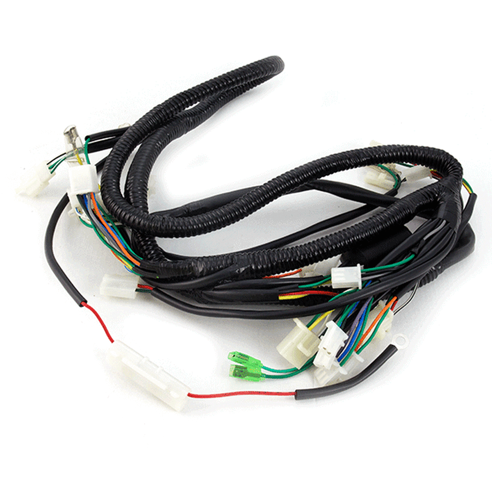 A motorcycle wiring loom, also known as a wiring harness, is a bundle of wires and connectors that transmits electrical power and signals throughout the motorcycle. It organizes and protects the electrical wiring, ensuring connections between components such as the ignition system, lighting, and various sensors. The loom is typically wrapped in protective sheathing to guard against wear and damage, and is designed to streamline installation and maintain a neat, efficient electrical system.