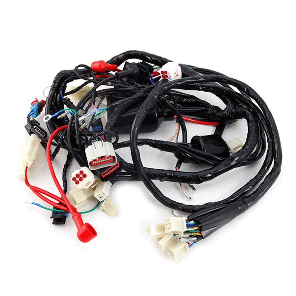 A motorcycle wiring loom, also known as a wiring harness, is a bundle of wires and connectors that transmits electrical power and signals throughout the motorcycle. It organizes and protects the electrical wiring, ensuring connections between components such as the ignition system, lighting, and various sensors. The loom is typically wrapped in protective sheathing to guard against wear and damage, and is designed to streamline installation and maintain a neat, efficient electrical system.