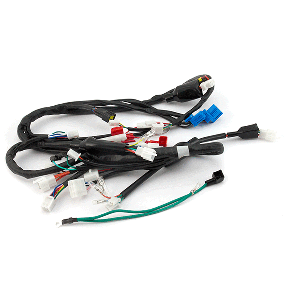 A motorcycle wiring loom, also known as a wiring harness, is a bundle of wires and connectors that transmits electrical power and signals throughout the motorcycle. It organizes and protects the electrical wiring, ensuring connections between components such as the ignition system, lighting, and various sensors. The loom is typically wrapped in protective sheathing to guard against wear and damage, and is designed to streamline installation and maintain a neat, efficient electrical system.
