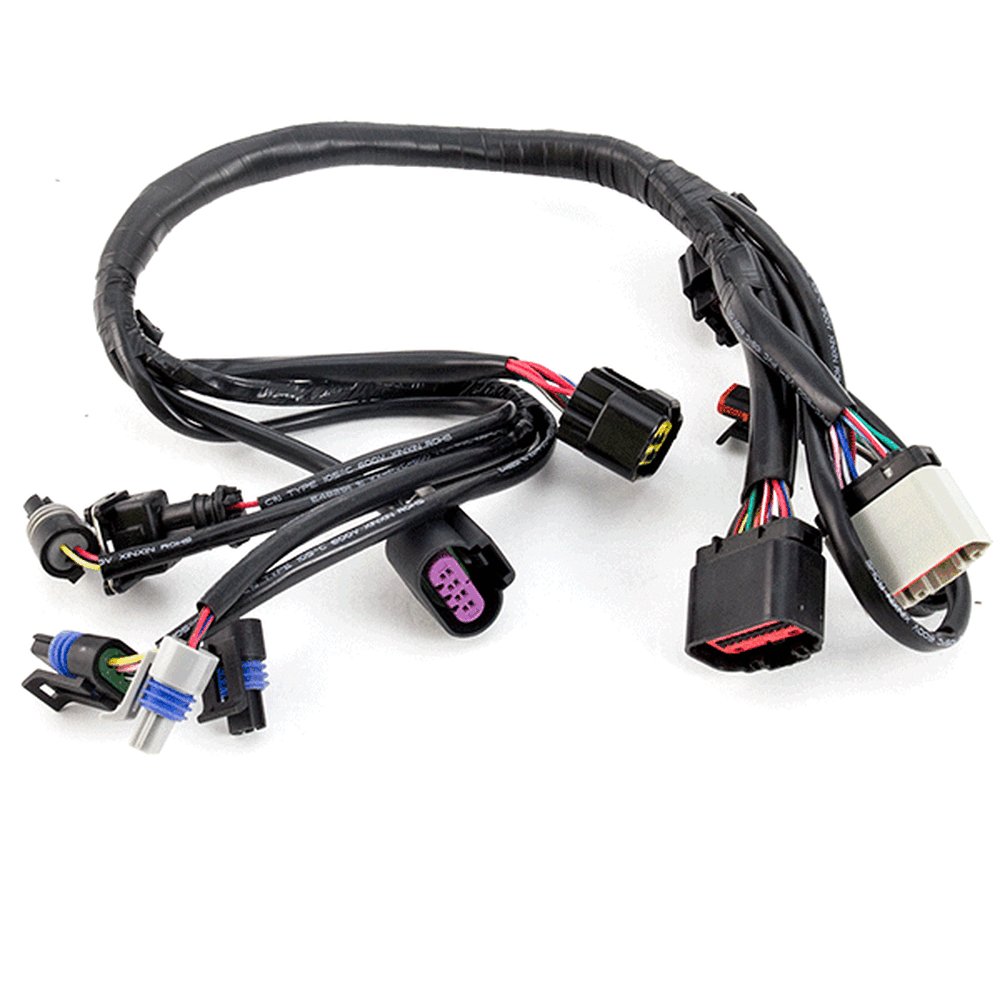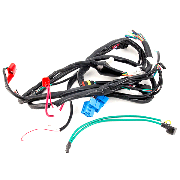 A motorcycle wiring loom, also known as a wiring harness, is a bundle of wires and connectors that transmits electrical power and signals throughout the motorcycle. It organizes and protects the electrical wiring, ensuring connections between components such as the ignition system, lighting, and various sensors. The loom is typically wrapped in protective sheathing to guard against wear and damage, and is designed to streamline installation and maintain a neat, efficient electrical system.