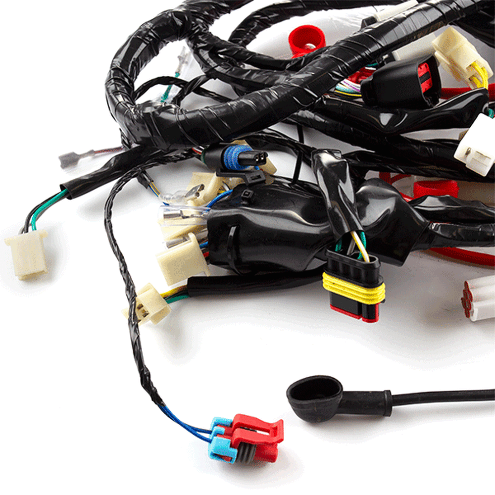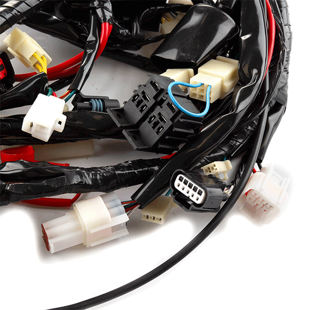 A motorcycle wiring loom, also known as a wiring harness, is a bundle of wires and connectors that transmits electrical power and signals throughout the motorcycle. It organizes and protects the electrical wiring, ensuring connections between components such as the ignition system, lighting, and various sensors. The loom is typically wrapped in protective sheathing to guard against wear and damage, and is designed to streamline installation and maintain a neat, efficient electrical system.
