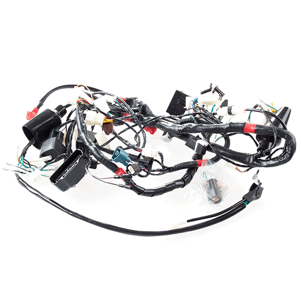 A motorcycle wiring loom, also known as a wiring harness, is a bundle of wires and connectors that transmits electrical power and signals throughout the motorcycle. It organizes and protects the electrical wiring, ensuring connections between components such as the ignition system, lighting, and various sensors. The loom is typically wrapped in protective sheathing to guard against wear and damage, and is designed to streamline installation and maintain a neat, efficient electrical system.