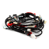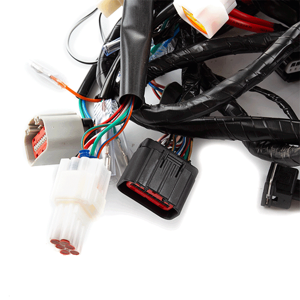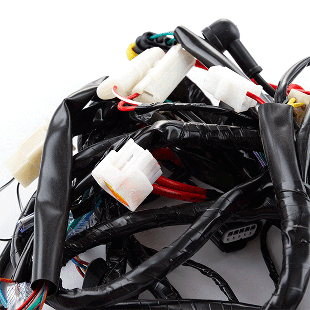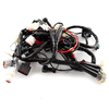 A motorcycle wiring loom, also known as a wiring harness, is a bundle of wires and connectors that transmits electrical power and signals throughout the motorcycle. It organizes and protects the electrical wiring, ensuring connections between components such as the ignition system, lighting, and various sensors. The loom is typically wrapped in protective sheathing to guard against wear and damage, and is designed to streamline installation and maintain a neat, efficient electrical system.