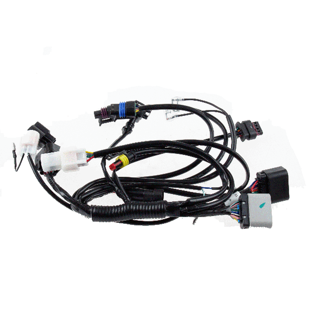 A motorcycle wiring loom, also known as a wiring harness, is a bundle of wires and connectors that transmits electrical power and signals throughout the motorcycle. It organizes and protects the electrical wiring, ensuring connections between components such as the ignition system, lighting, and various sensors. The loom is typically wrapped in protective sheathing to guard against wear and damage, and is designed to streamline installation and maintain a neat, efficient electrical system.