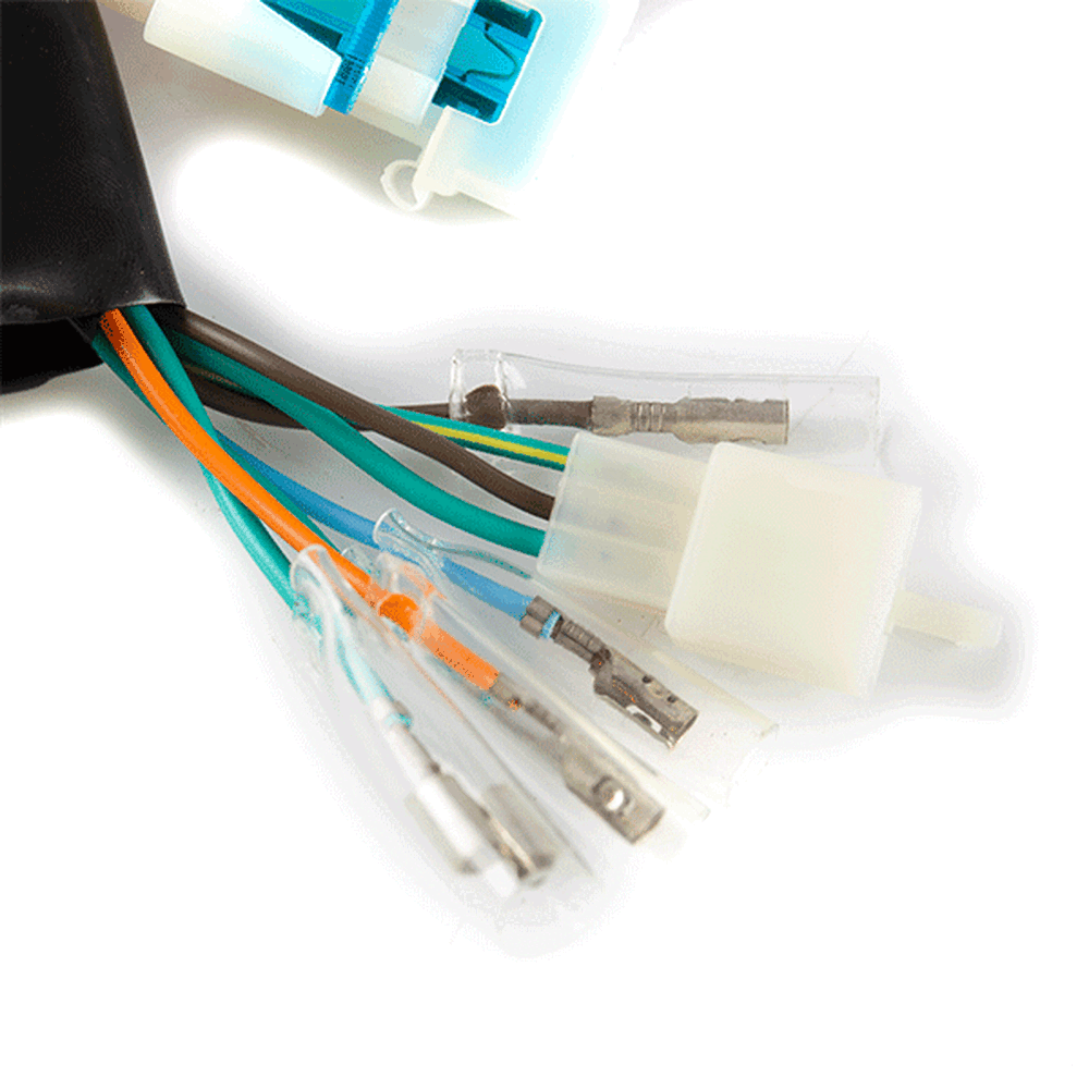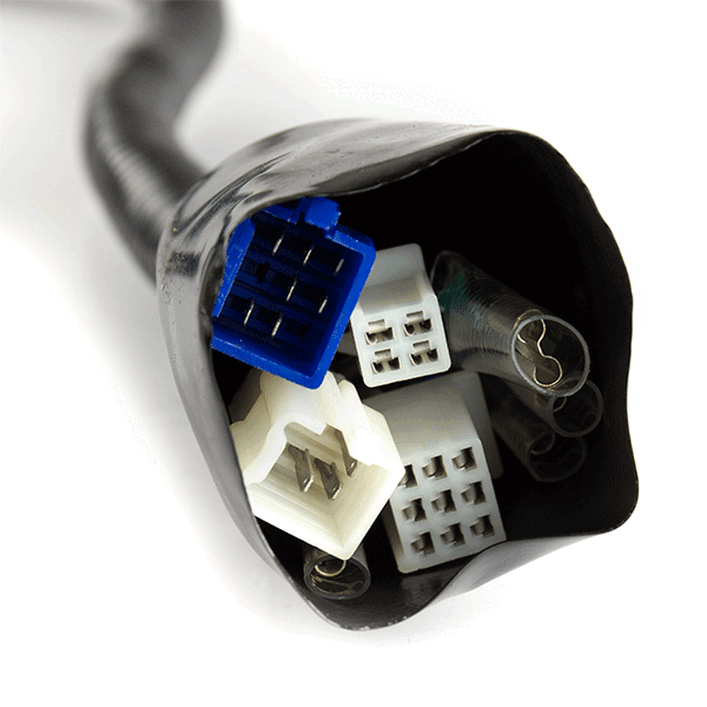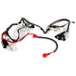 A motorcycle wiring loom, also known as a wiring harness, is a bundle of wires and connectors that transmits electrical power and signals throughout the motorcycle. It organizes and protects the electrical wiring, ensuring connections between components such as the ignition system, lighting, and various sensors. The loom is typically wrapped in protective sheathing to guard against wear and damage, and is designed to streamline installation and maintain a neat, efficient electrical system.