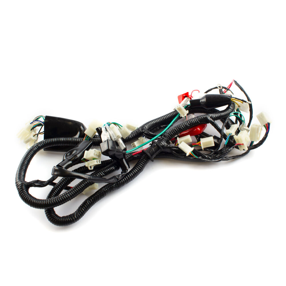 A motorcycle wiring loom, also known as a wiring harness, is a bundle of wires and connectors that transmits electrical power and signals throughout the motorcycle. It organizes and protects the electrical wiring, ensuring connections between components such as the ignition system, lighting, and various sensors. The loom is typically wrapped in protective sheathing to guard against wear and damage, and is designed to streamline installation and maintain a neat, efficient electrical system.