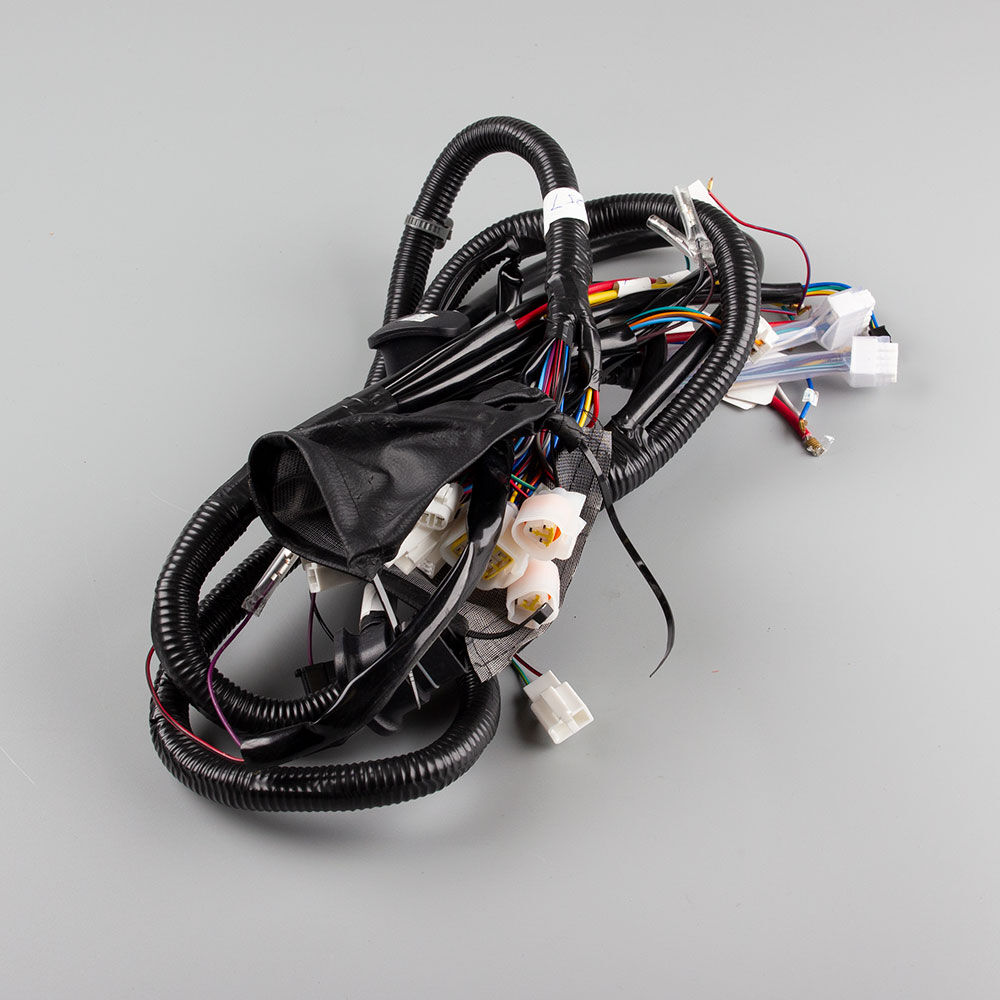 A motorcycle wiring loom, also known as a wiring harness, is a bundle of wires and connectors that transmits electrical power and signals throughout the motorcycle. It organizes and protects the electrical wiring, ensuring connections between components such as the ignition system, lighting, and various sensors. The loom is typically wrapped in protective sheathing to guard against wear and damage, and is designed to streamline installation and maintain a neat, efficient electrical system.
