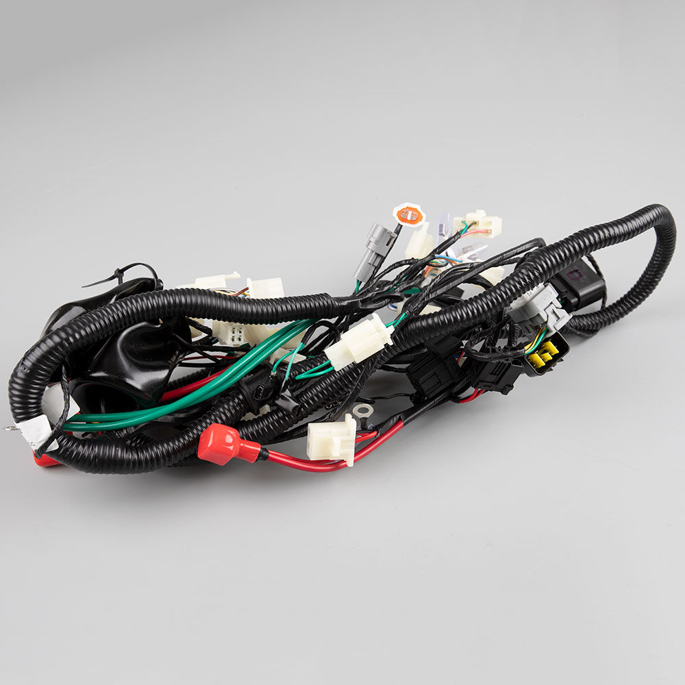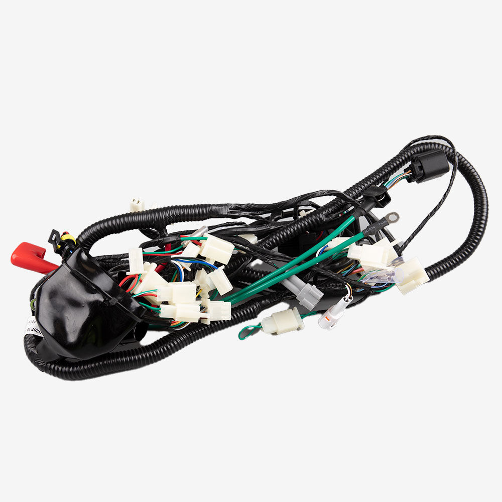 A motorcycle wiring loom, also known as a wiring harness, is a bundle of wires and connectors that transmits electrical power and signals throughout the motorcycle. It organizes and protects the electrical wiring, ensuring connections between components such as the ignition system, lighting, and various sensors. The loom is typically wrapped in protective sheathing to guard against wear and damage, and is designed to streamline installation and maintain a neat, efficient electrical system.
