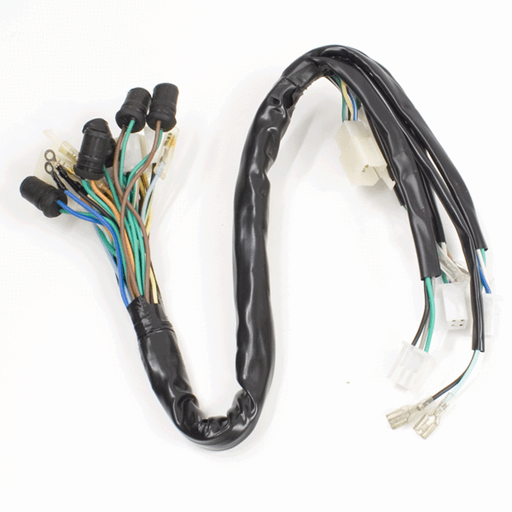 A motorcycle wiring loom, also known as a wiring harness, is a bundle of wires and connectors that transmits electrical power and signals throughout the motorcycle. It organizes and protects the electrical wiring, ensuring connections between components such as the ignition system, lighting, and various sensors. The loom is typically wrapped in protective sheathing to guard against wear and damage, and is designed to streamline installation and maintain a neat, efficient electrical system.