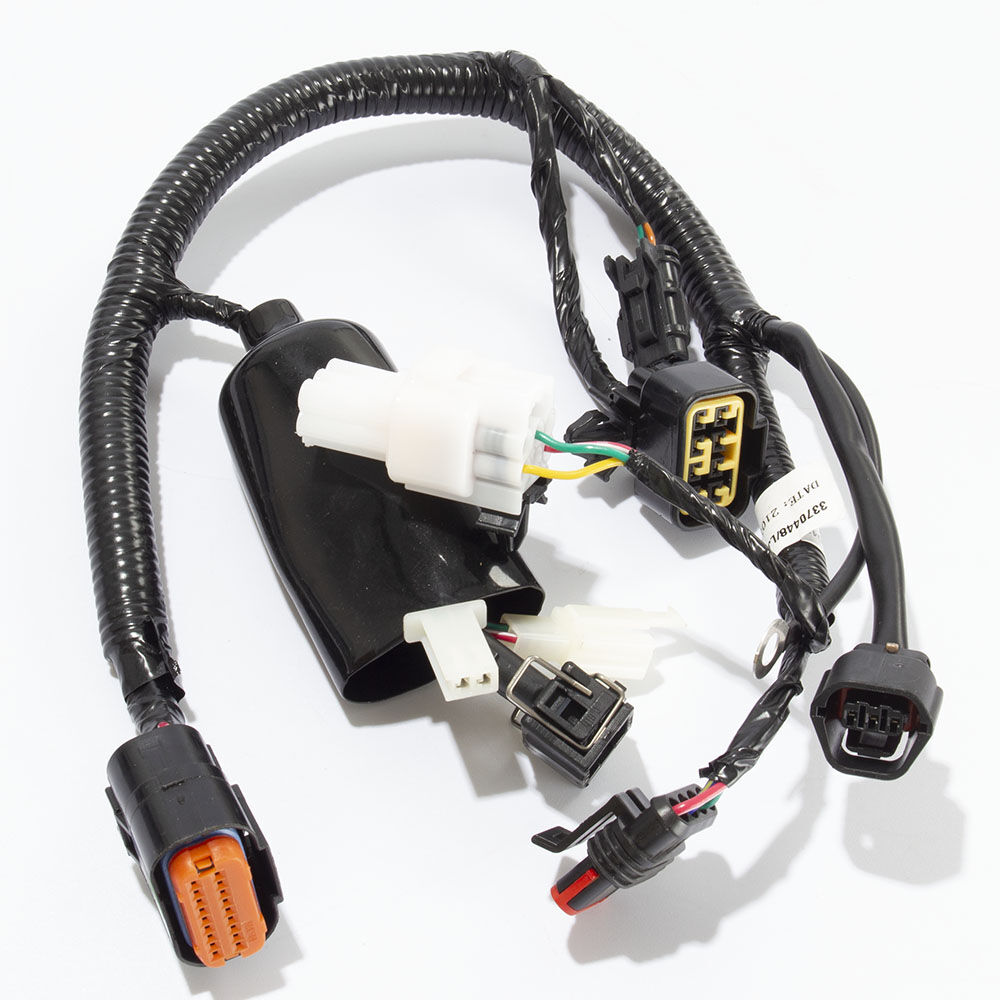 A motorcycle wiring loom, also known as a wiring harness, is a bundle of wires and connectors that transmits electrical power and signals throughout the motorcycle. It organizes and protects the electrical wiring, ensuring connections between components such as the ignition system, lighting, and various sensors. The loom is typically wrapped in protective sheathing to guard against wear and damage, and is designed to streamline installation and maintain a neat, efficient electrical system.
