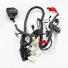 A motorcycle wiring loom, also known as a wiring harness, is a bundle of wires and connectors that transmits electrical power and signals throughout the motorcycle. It organizes and protects the electrical wiring, ensuring connections between components such as the ignition system, lighting, and various sensors. The loom is typically wrapped in protective sheathing to guard against wear and damage, and is designed to streamline installation and maintain a neat, efficient electrical system.