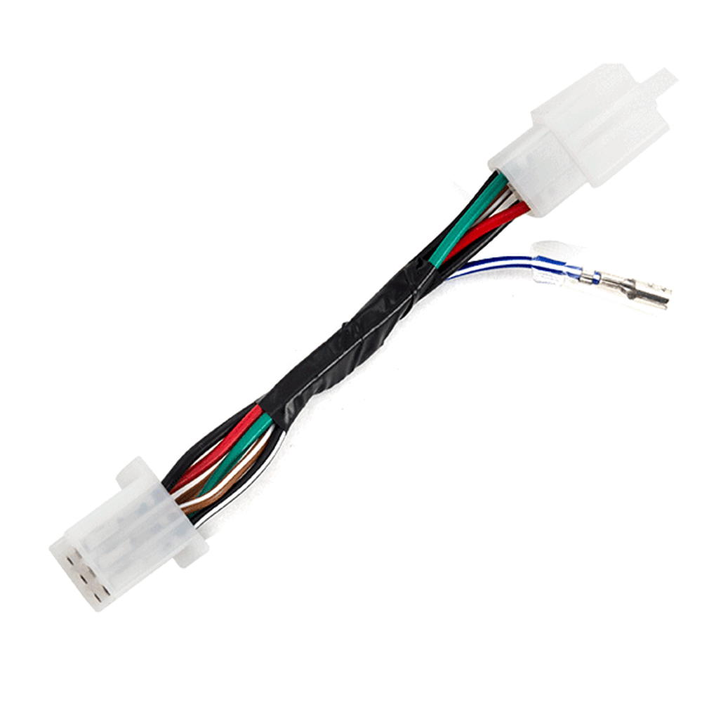 A motorcycle wiring loom, also known as a wiring harness, is a bundle of wires and connectors that transmits electrical power and signals throughout the motorcycle. It organizes and protects the electrical wiring, ensuring connections between components such as the ignition system, lighting, and various sensors. The loom is typically wrapped in protective sheathing to guard against wear and damage, and is designed to streamline installation and maintain a neat, efficient electrical system.
