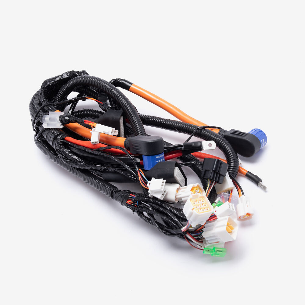 A motorcycle wiring loom, also known as a wiring harness, is a bundle of wires and connectors that transmits electrical power and signals throughout the motorcycle. It organizes and protects the electrical wiring, ensuring connections between components such as the ignition system, lighting, and various sensors. The loom is typically wrapped in protective sheathing to guard against wear and damage, and is designed to streamline installation and maintain a neat, efficient electrical system.