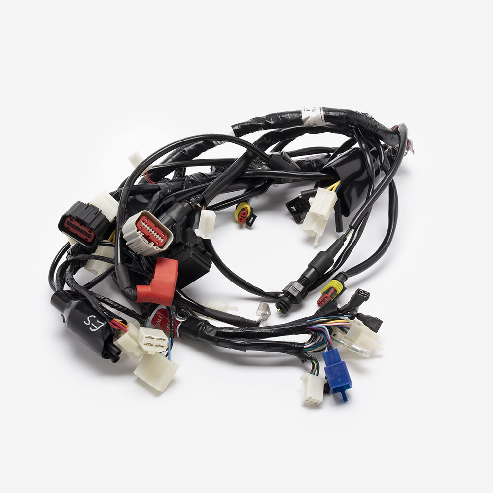 A motorcycle wiring loom, also known as a wiring harness, is a bundle of wires and connectors that transmits electrical power and signals throughout the motorcycle. It organizes and protects the electrical wiring, ensuring connections between components such as the ignition system, lighting, and various sensors. The loom is typically wrapped in protective sheathing to guard against wear and damage, and is designed to streamline installation and maintain a neat, efficient electrical system.