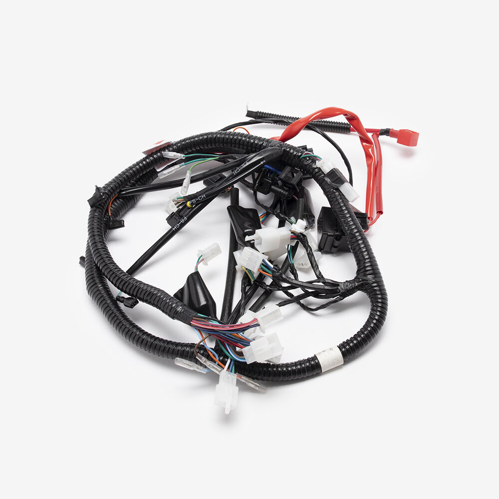 A motorcycle wiring loom, also known as a wiring harness, is a bundle of wires and connectors that transmits electrical power and signals throughout the motorcycle. It organizes and protects the electrical wiring, ensuring connections between components such as the ignition system, lighting, and various sensors. The loom is typically wrapped in protective sheathing to guard against wear and damage, and is designed to streamline installation and maintain a neat, efficient electrical system.