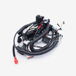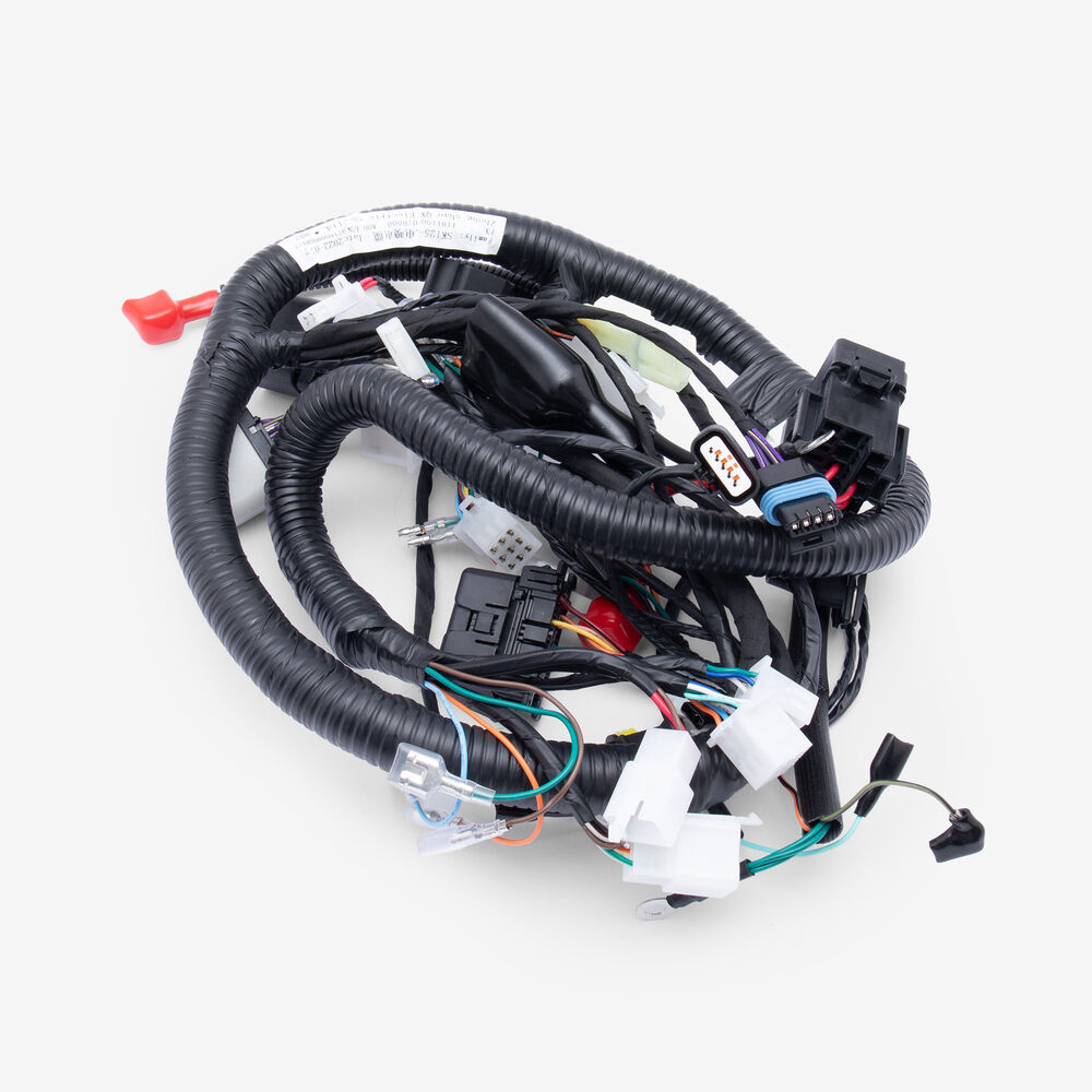 A motorcycle wiring loom, also known as a wiring harness, is a bundle of wires and connectors that transmits electrical power and signals throughout the motorcycle. It organizes and protects the electrical wiring, ensuring connections between components such as the ignition system, lighting, and various sensors. The loom is typically wrapped in protective sheathing to guard against wear and damage, and is designed to streamline installation and maintain a neat, efficient electrical system.