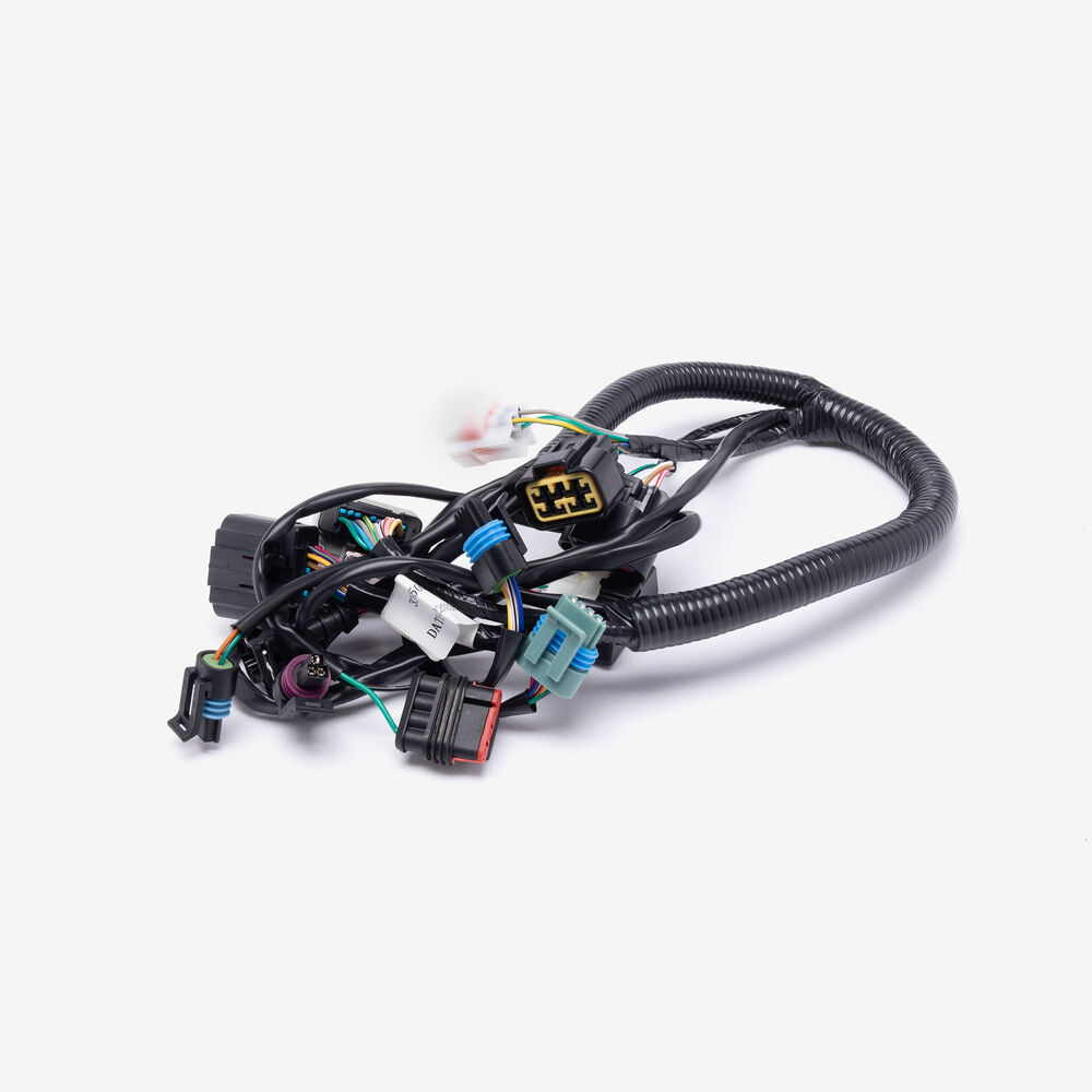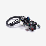 A motorcycle wiring loom, also known as a wiring harness, is a bundle of wires and connectors that transmits electrical power and signals throughout the motorcycle. It organizes and protects the electrical wiring, ensuring connections between components such as the ignition system, lighting, and various sensors. The loom is typically wrapped in protective sheathing to guard against wear and damage, and is designed to streamline installation and maintain a neat, efficient electrical system.
