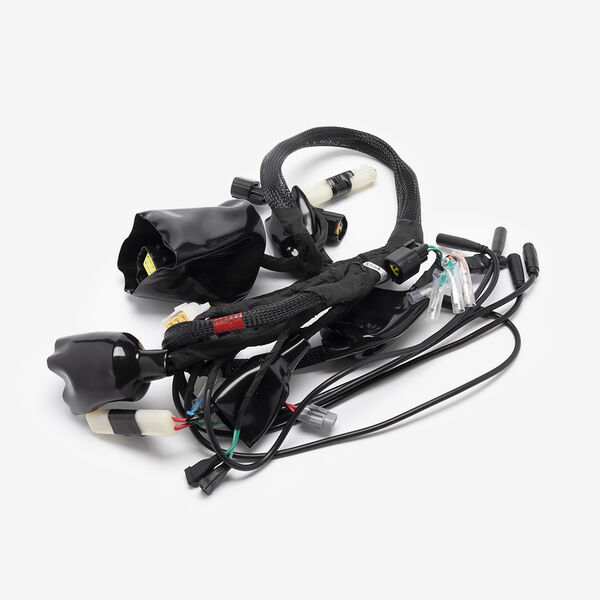 A motorcycle wiring loom, also known as a wiring harness, is a bundle of wires and connectors that transmits electrical power and signals throughout the motorcycle. It organizes and protects the electrical wiring, ensuring connections between components such as the ignition system, lighting, and various sensors. The loom is typically wrapped in protective sheathing to guard against wear and damage, and is designed to streamline installation and maintain a neat, efficient electrical system.