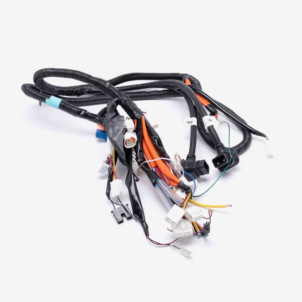 A motorcycle wiring loom, also known as a wiring harness, is a bundle of wires and connectors that transmits electrical power and signals throughout the motorcycle. It organizes and protects the electrical wiring, ensuring connections between components such as the ignition system, lighting, and various sensors. The loom is typically wrapped in protective sheathing to guard against wear and damage, and is designed to streamline installation and maintain a neat, efficient electrical system.
