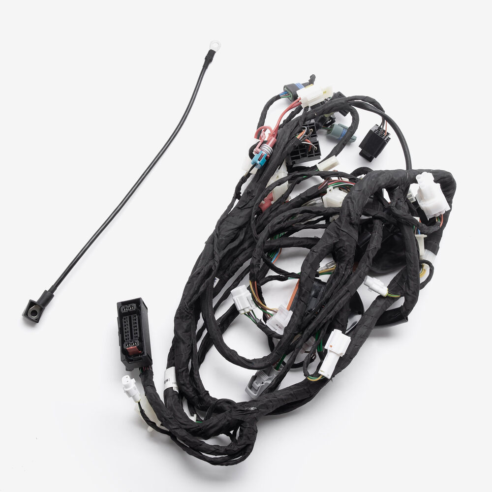 A motorcycle wiring loom, also known as a wiring harness, is a bundle of wires and connectors that transmits electrical power and signals throughout the motorcycle. It organizes and protects the electrical wiring, ensuring connections between components such as the ignition system, lighting, and various sensors. The loom is typically wrapped in protective sheathing to guard against wear and damage, and is designed to streamline installation and maintain a neat, efficient electrical system.