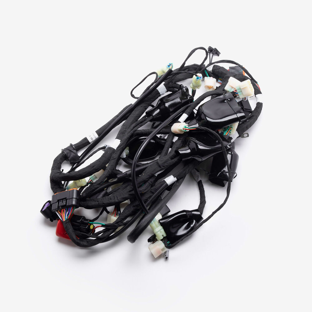 A motorcycle wiring loom, also known as a wiring harness, is a bundle of wires and connectors that transmits electrical power and signals throughout the motorcycle. It organizes and protects the electrical wiring, ensuring connections between components such as the ignition system, lighting, and various sensors. The loom is typically wrapped in protective sheathing to guard against wear and damage, and is designed to streamline installation and maintain a neat, efficient electrical system.