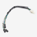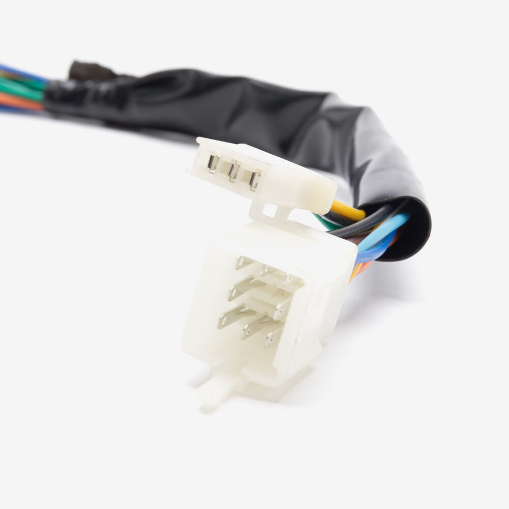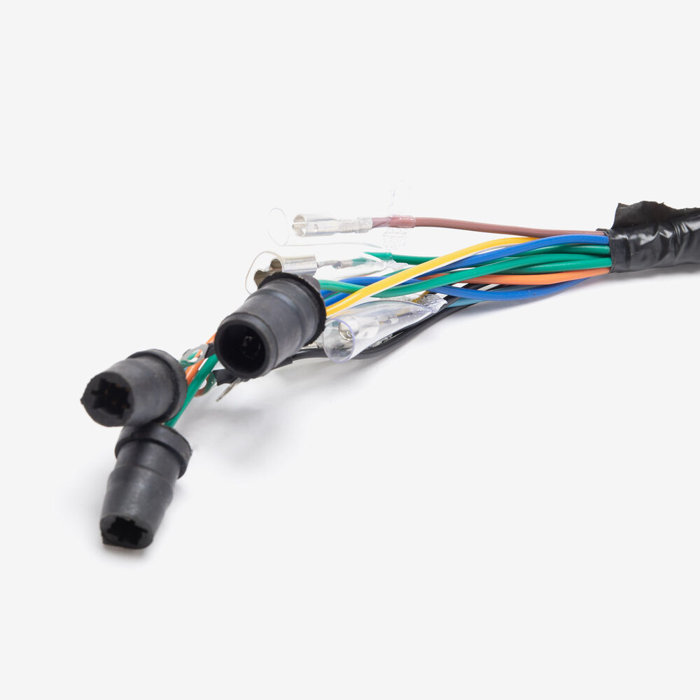 A motorcycle wiring loom, also known as a wiring harness, is a bundle of wires and connectors that transmits electrical power and signals throughout the motorcycle. It organizes and protects the electrical wiring, ensuring connections between components such as the ignition system, lighting, and various sensors. The loom is typically wrapped in protective sheathing to guard against wear and damage, and is designed to streamline installation and maintain a neat, efficient electrical system.
