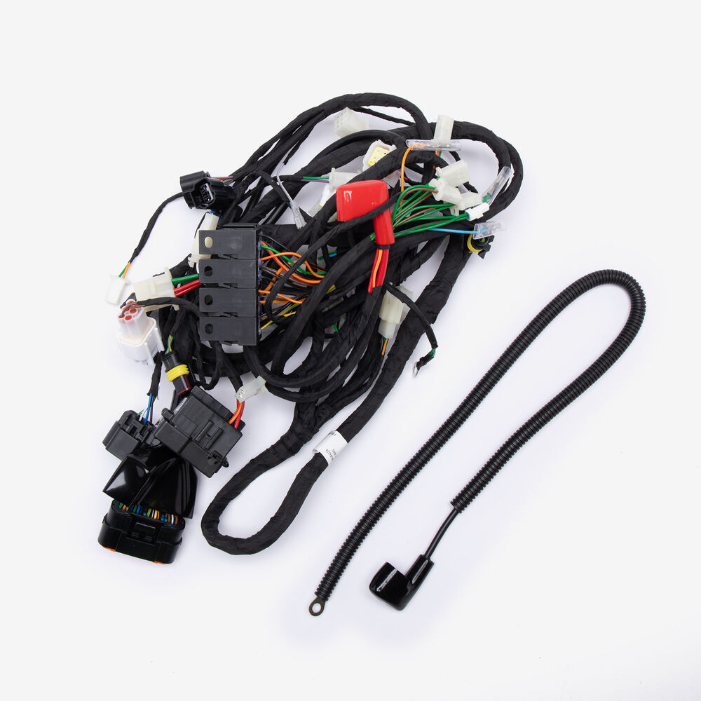 A motorcycle wiring loom, also known as a wiring harness, is a bundle of wires and connectors that transmits electrical power and signals throughout the motorcycle. It organizes and protects the electrical wiring, ensuring connections between components such as the ignition system, lighting, and various sensors. The loom is typically wrapped in protective sheathing to guard against wear and damage, and is designed to streamline installation and maintain a neat, efficient electrical system.