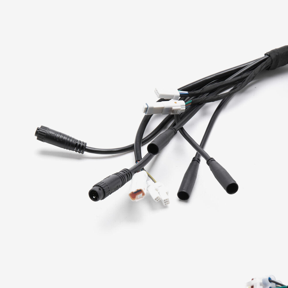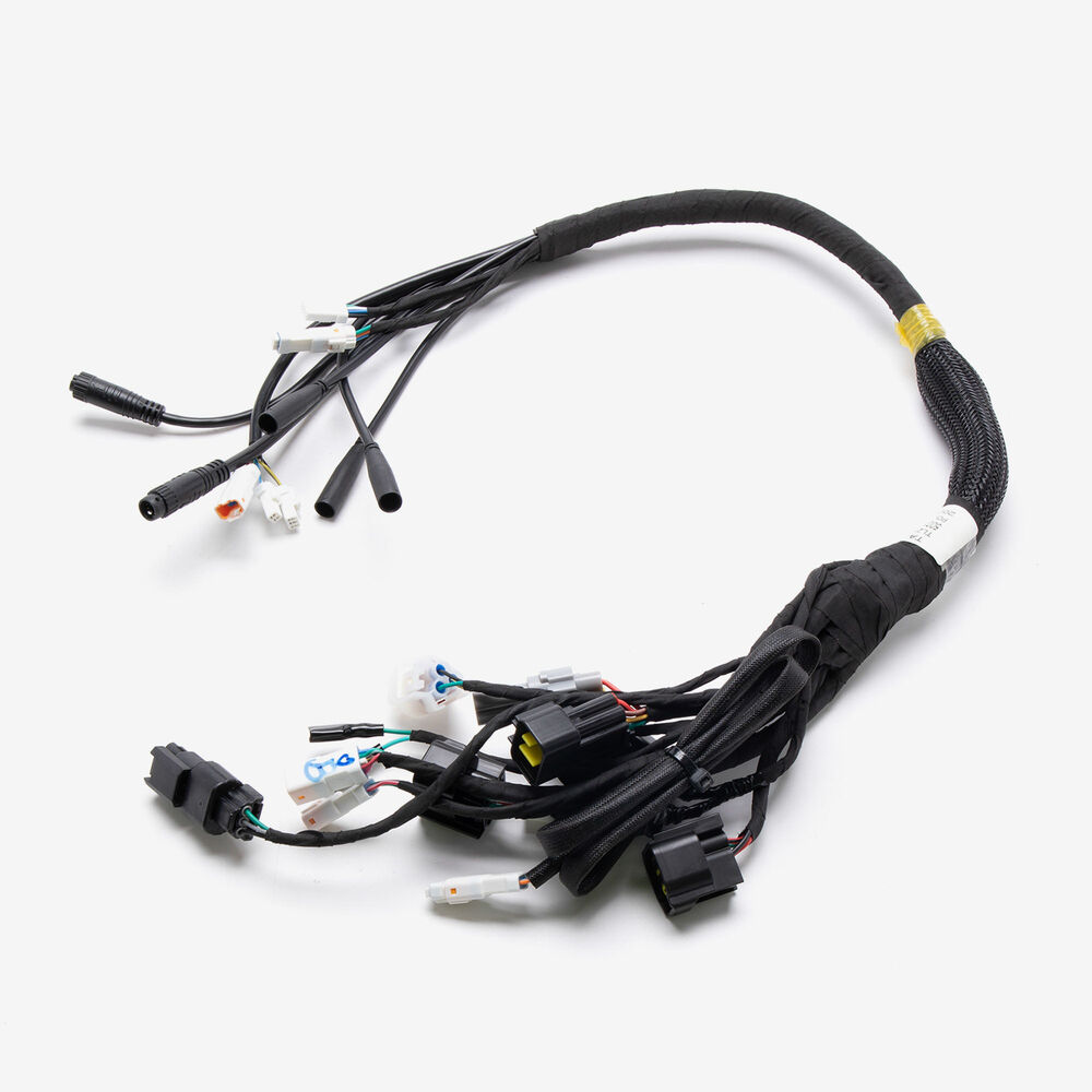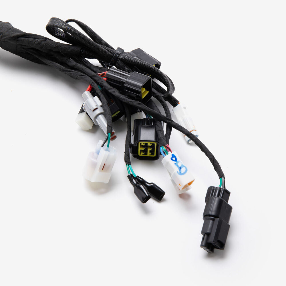 A motorcycle wiring loom, also known as a wiring harness, is a bundle of wires and connectors that transmits electrical power and signals throughout the motorcycle. It organizes and protects the electrical wiring, ensuring connections between components such as the ignition system, lighting, and various sensors. The loom is typically wrapped in protective sheathing to guard against wear and damage, and is designed to streamline installation and maintain a neat, efficient electrical system.