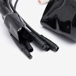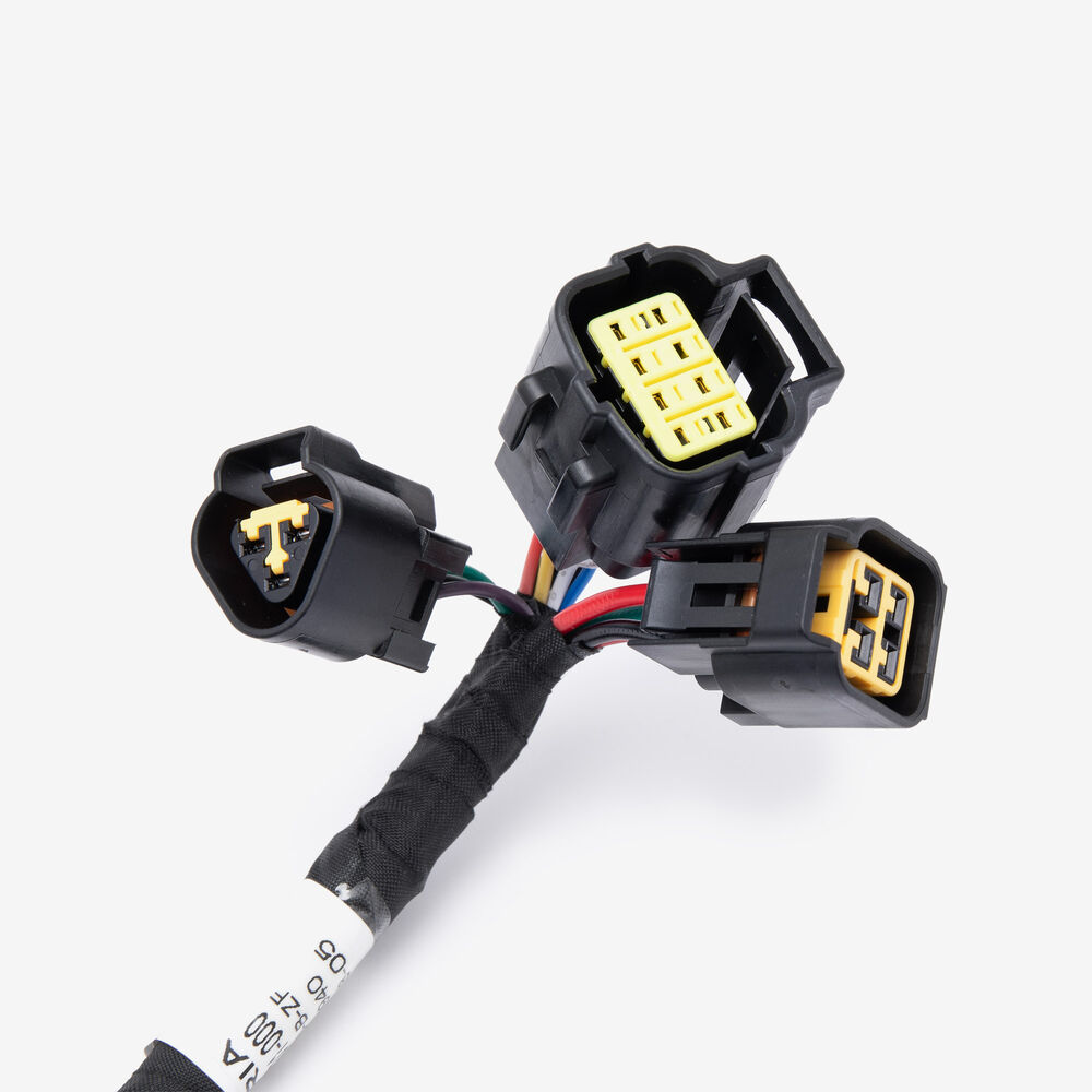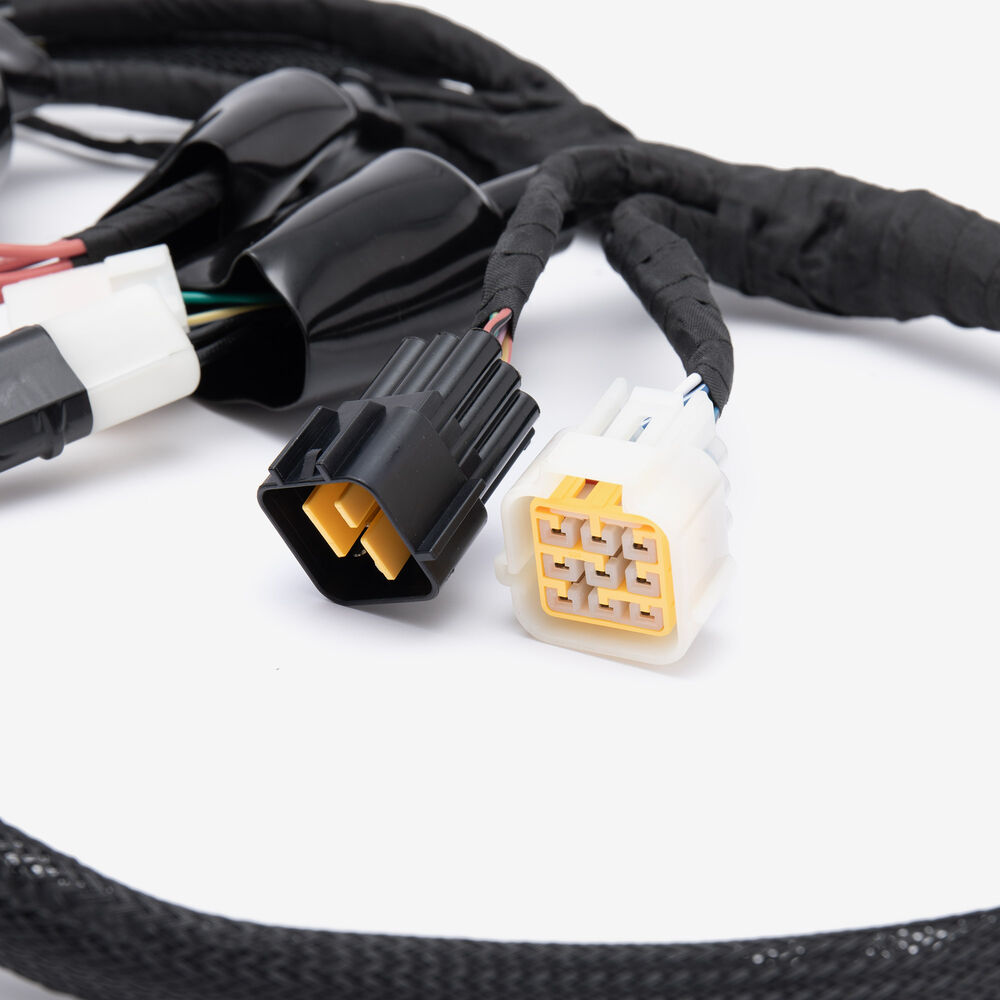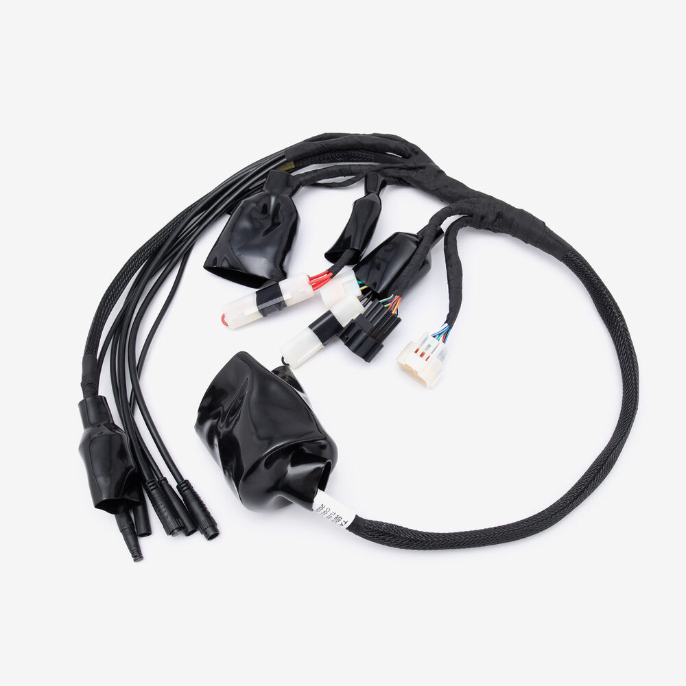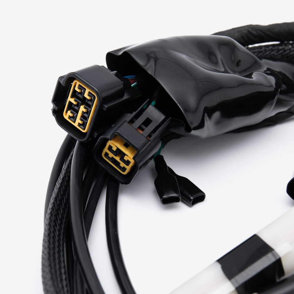 A motorcycle wiring loom, also known as a wiring harness, is a bundle of wires and connectors that transmits electrical power and signals throughout the motorcycle. It organizes and protects the electrical wiring, ensuring connections between components such as the ignition system, lighting, and various sensors. The loom is typically wrapped in protective sheathing to guard against wear and damage, and is designed to streamline installation and maintain a neat, efficient electrical system.