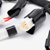 A motorcycle wiring loom, also known as a wiring harness, is a bundle of wires and connectors that transmits electrical power and signals throughout the motorcycle. It organizes and protects the electrical wiring, ensuring connections between components such as the ignition system, lighting, and various sensors. The loom is typically wrapped in protective sheathing to guard against wear and damage, and is designed to streamline installation and maintain a neat, efficient electrical system.