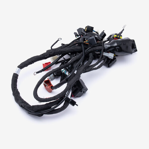 A motorcycle wiring loom, also known as a wiring harness, is a bundle of wires and connectors that transmits electrical power and signals throughout the motorcycle. It organizes and protects the electrical wiring, ensuring connections between components such as the ignition system, lighting, and various sensors. The loom is typically wrapped in protective sheathing to guard against wear and damage, and is designed to streamline installation and maintain a neat, efficient electrical system.
