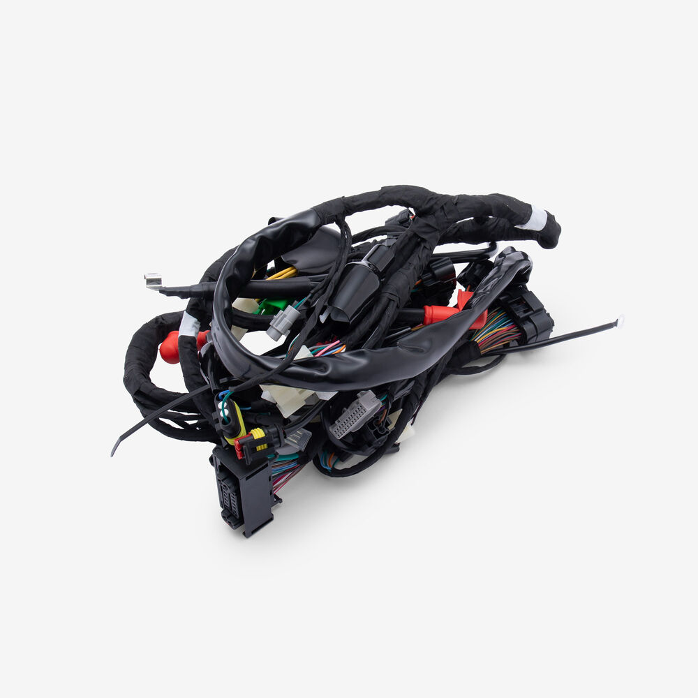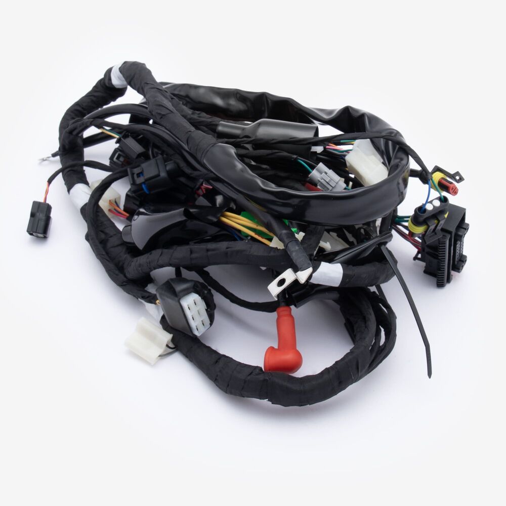 A motorcycle wiring loom, also known as a wiring harness, is a bundle of wires and connectors that transmits electrical power and signals throughout the motorcycle. It organizes and protects the electrical wiring, ensuring connections between components such as the ignition system, lighting, and various sensors. The loom is typically wrapped in protective sheathing to guard against wear and damage, and is designed to streamline installation and maintain a neat, efficient electrical system.