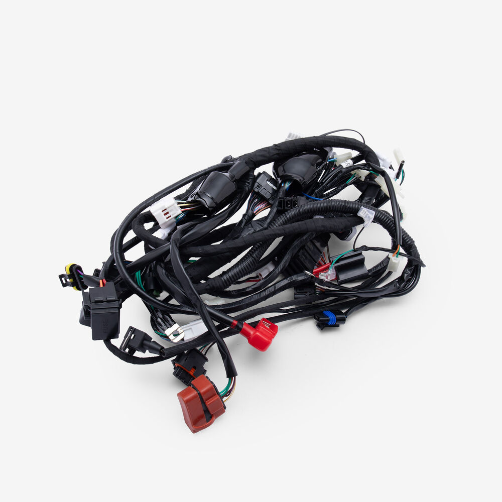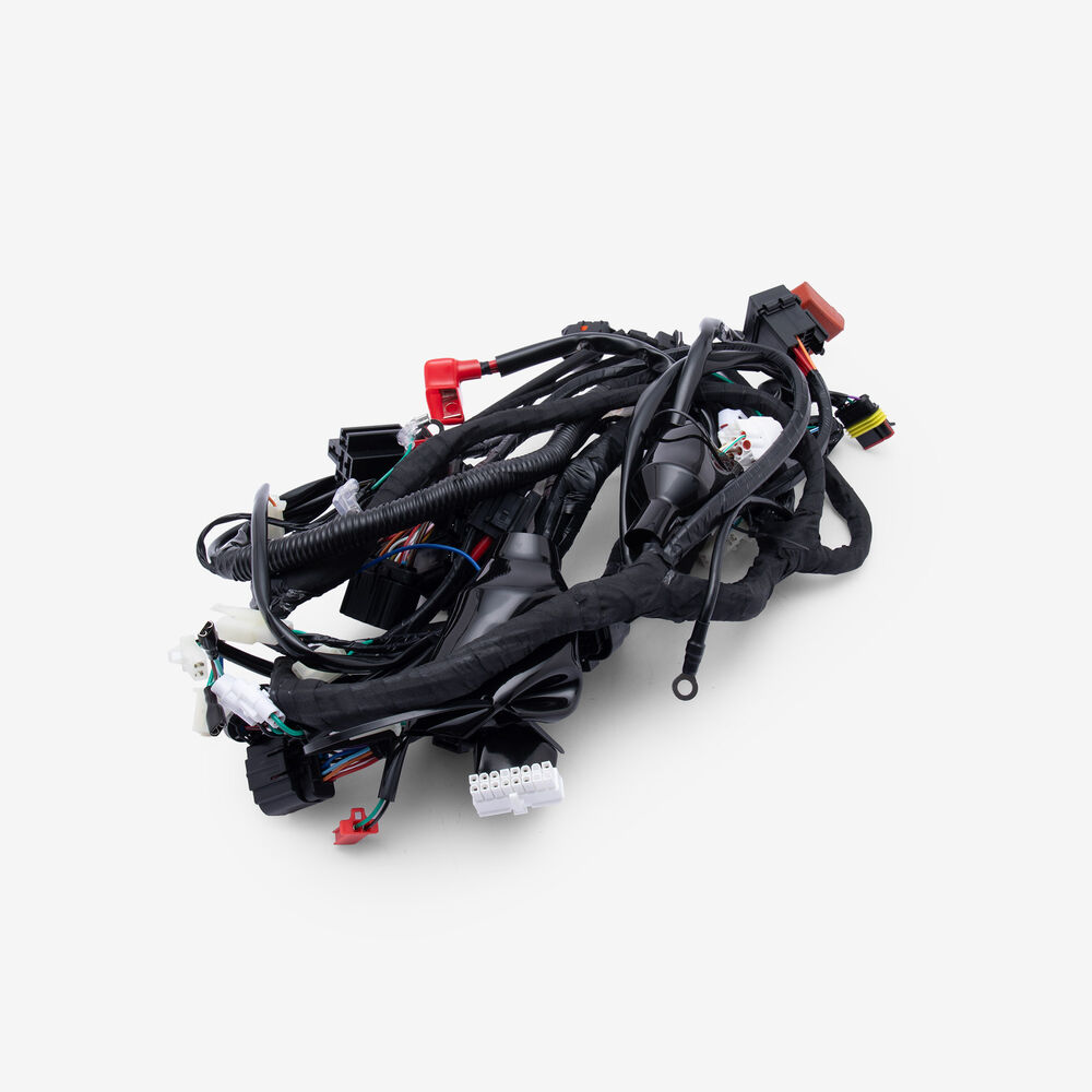 A motorcycle wiring loom, also known as a wiring harness, is a bundle of wires and connectors that transmits electrical power and signals throughout the motorcycle. It organizes and protects the electrical wiring, ensuring connections between components such as the ignition system, lighting, and various sensors. The loom is typically wrapped in protective sheathing to guard against wear and damage, and is designed to streamline installation and maintain a neat, efficient electrical system.