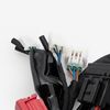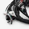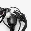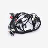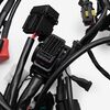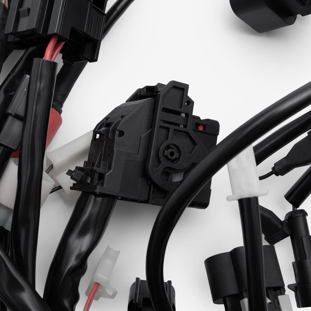 A motorcycle wiring loom, also known as a wiring harness, is a bundle of wires and connectors that transmits electrical power and signals throughout the motorcycle. It organizes and protects the electrical wiring, ensuring connections between components such as the ignition system, lighting, and various sensors. The loom is typically wrapped in protective sheathing to guard against wear and damage, and is designed to streamline installation and maintain a neat, efficient electrical system.