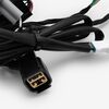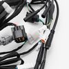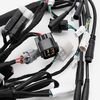 A motorcycle wiring loom, also known as a wiring harness, is a bundle of wires and connectors that transmits electrical power and signals throughout the motorcycle. It organizes and protects the electrical wiring, ensuring connections between components such as the ignition system, lighting, and various sensors. The loom is typically wrapped in protective sheathing to guard against wear and damage, and is designed to streamline installation and maintain a neat, efficient electrical system.