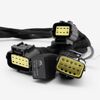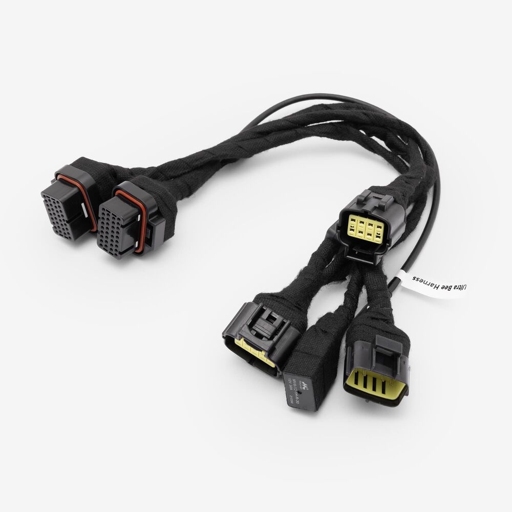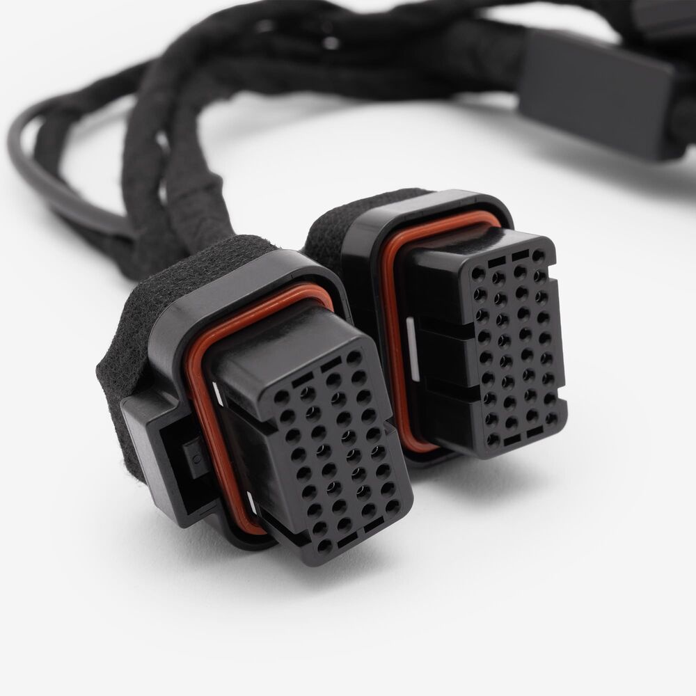 A motorcycle wiring loom, also known as a wiring harness, is a bundle of wires and connectors that transmits electrical power and signals throughout the motorcycle. It organizes and protects the electrical wiring, ensuring connections between components such as the ignition system, lighting, and various sensors. The loom is typically wrapped in protective sheathing to guard against wear and damage, and is designed to streamline installation and maintain a neat, efficient electrical system.