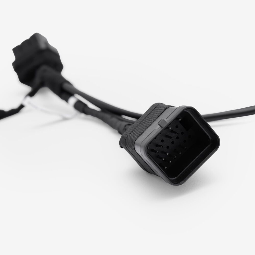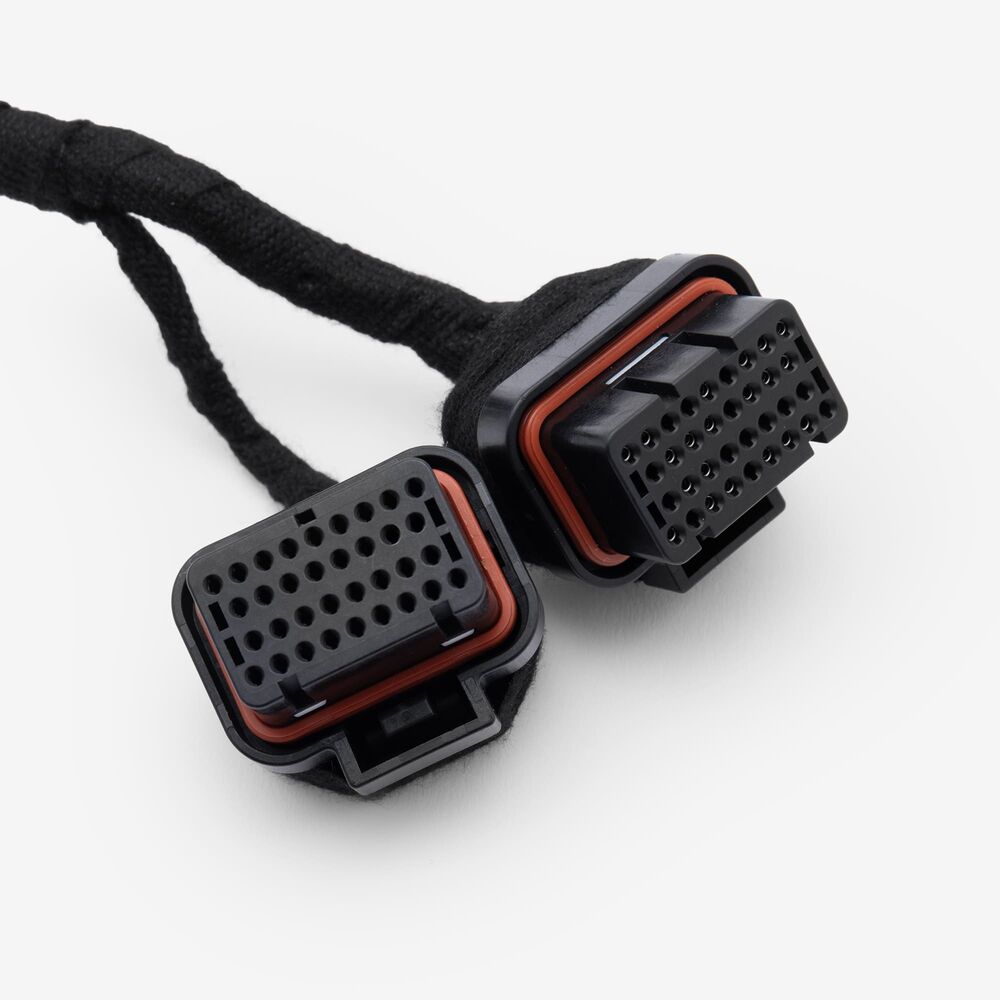 A motorcycle wiring loom, also known as a wiring harness, is a bundle of wires and connectors that transmits electrical power and signals throughout the motorcycle. It organizes and protects the electrical wiring, ensuring connections between components such as the ignition system, lighting, and various sensors. The loom is typically wrapped in protective sheathing to guard against wear and damage, and is designed to streamline installation and maintain a neat, efficient electrical system.