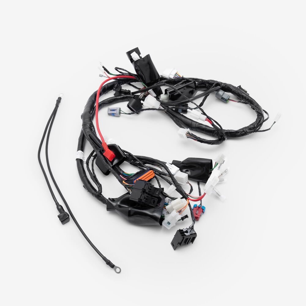 A motorcycle wiring loom, also known as a wiring harness, is a bundle of wires and connectors that transmits electrical power and signals throughout the motorcycle. It organizes and protects the electrical wiring, ensuring connections between components such as the ignition system, lighting, and various sensors. The loom is typically wrapped in protective sheathing to guard against wear and damage, and is designed to streamline installation and maintain a neat, efficient electrical system.