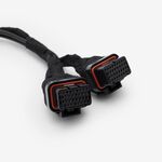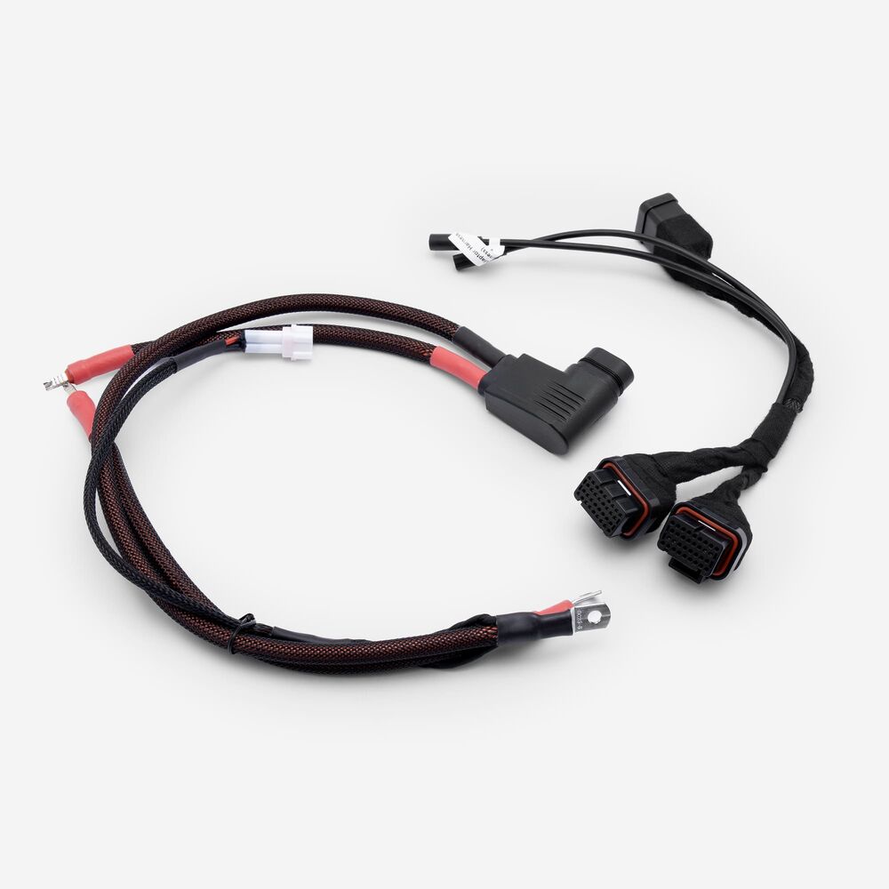 A motorcycle wiring loom, also known as a wiring harness, is a bundle of wires and connectors that transmits electrical power and signals throughout the motorcycle. It organizes and protects the electrical wiring, ensuring connections between components such as the ignition system, lighting, and various sensors. The loom is typically wrapped in protective sheathing to guard against wear and damage, and is designed to streamline installation and maintain a neat, efficient electrical system.